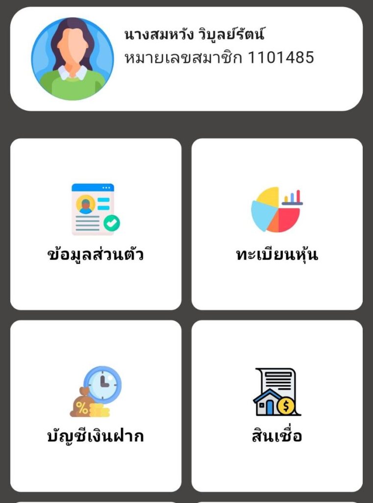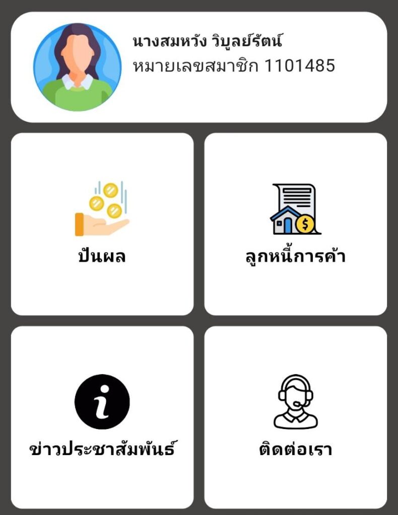 แสดงข้อมูลสมาชิกของสหกรณ์การเกษตร อาทิเช่น ข้อมูลส่วนตัว การถือหุ้น ข้อมูลสินเชื่อ ข้อมูลบัญชีเงินฝากธุรกรรมทางการเงิน ปันผลการตลาด ลูกหนี้การค้า และอื่นๆ เป็นต้น